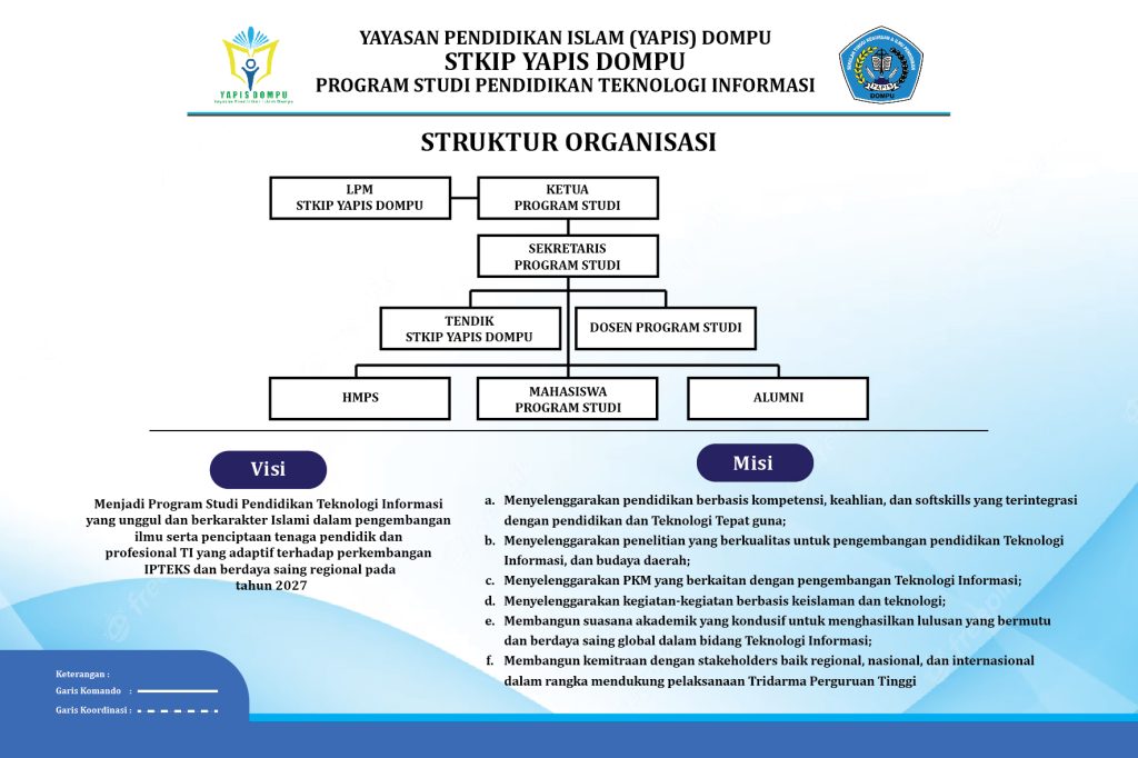 Tata pamong Program Studi Pendidikan Teknologi Informasi STKIP Yapis Dompu diselenggarakan secara terstruktur dan berjenjang dengan mengacu pada sistem tata kelola institusi, yang menempatkan Ketua Program Studi sebagai penanggung jawab utama dalam perencanaan, pelaksanaan, pengendalian, dan evaluasi seluruh kegiatan akademik dan nonakademik program studi. Pelaksanaan tata pamong didukung oleh Sekretaris Program Studi, dosen, tenaga kependidikan, serta unit pendukung terkait melalui pembagian tugas dan kewenangan yang jelas, mekanisme koordinasi yang efektif, dan pengambilan keputusan yang partisipatif. Seluruh proses tata pamong dilaksanakan berdasarkan prinsip transparansi, akuntabilitas, tanggung jawab, keadilan, dan keberlanjutan, serta diperkuat oleh kebijakan internal, standar operasional prosedur, dan sistem penjaminan mutu internal (SPMI). Melalui tata pamong ini, Program Studi Pendidikan Teknologi Informasi memastikan terselenggaranya pendidikan, penelitian, dan pengabdian kepada masyarakat yang bermutu, adaptif terhadap perkembangan teknologi informasi, serta selaras dengan visi, misi, dan kebutuhan pemangku kepentingan. Uraian yang lebih rinci dan sistematis mengenai tata pamong Program Studi Pendidikan Teknologi Informasi STKIP Yapis Dompu dapat diakses pada dokumen Tata Pamong melalui link: Download.